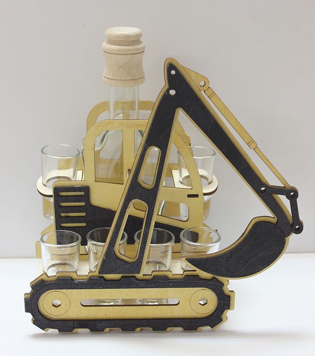 Dárkový set vyžezaný z překližky imituje bagr. Set je doplněn 6ks odlivek a karafou na slivovici. Tu si ale musíte doma dolít.