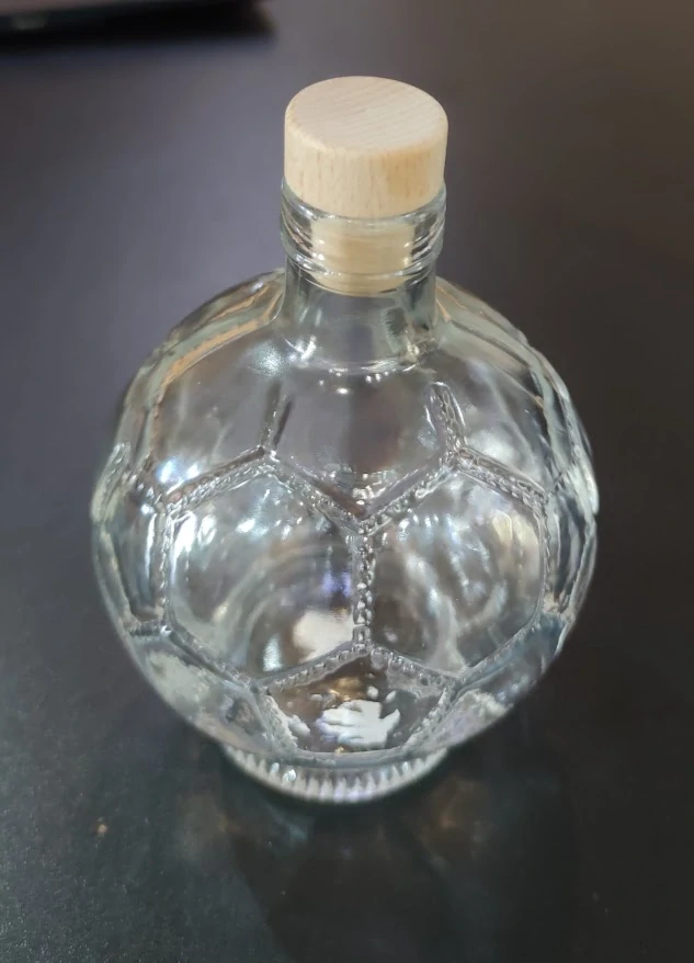 Skleněná láhev na slivovici ve tvaru fotbalového míče, s dekorem švestek. Obsah 50cl Uzávěr . Vtipný dárek pro fotbalistu.