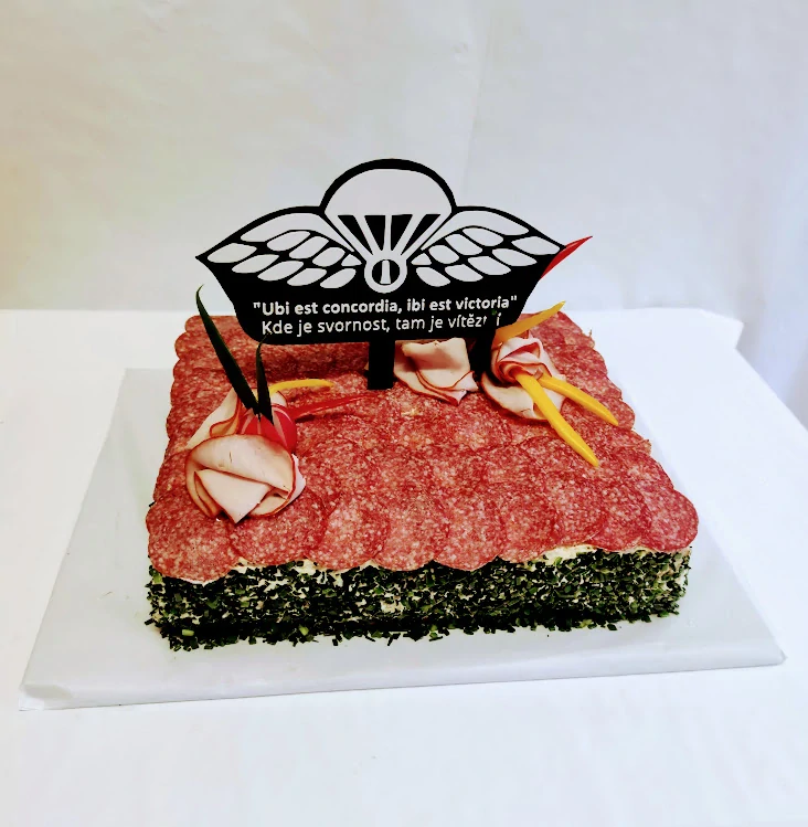 Salámový dort s tématickým zápichem pro skupinu parašutistů. Téma a nápis lze změnit dle přání zákazníka.